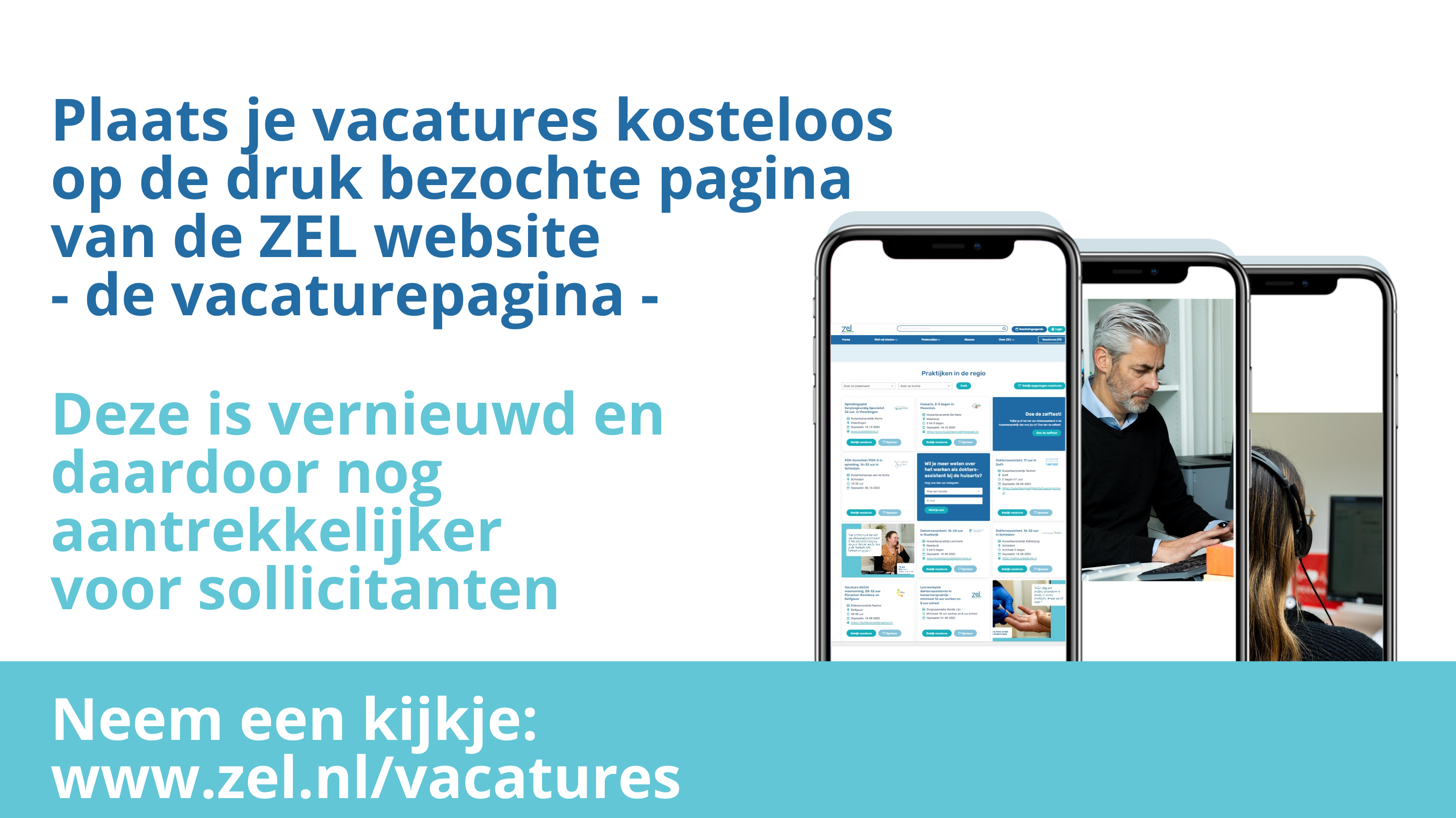 Op zoek naar een leuke afwisselende baan? Op onze webiste vind je vacatures van de praktijken uit de regio. Ook ZEL vacatures zijn te vinden op onze vacaturepagina. Neem snel een kijkje!