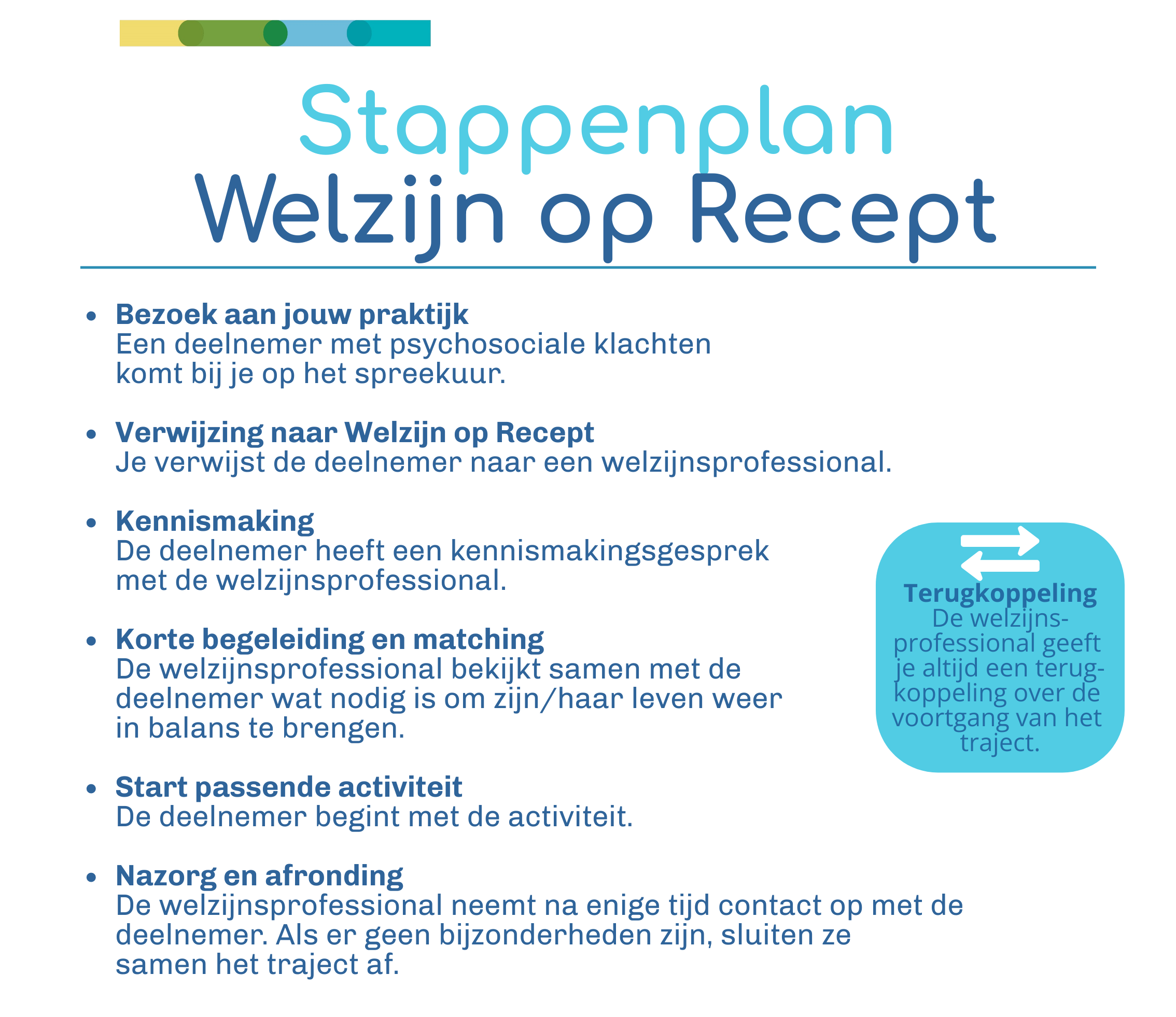 Als zorgverlener kun je een patiënt met milde psychosociale klachten doorverwijzen naar Welzijn op Recept. Een welzijnsprofessional gaat vervolgens met de deelnemer in gesprek. De behoeften van de patiënt en de dingen die voor hem of haar het leven de moeite waard maken, staan in dit gesprek centraal. De professional en deelnemer zoeken samen naar een passende oplossing of activiteit, zoals het aangaan van sociale ontmoetingen, sporten, vrijwilligerswerk of mantelzorgondersteuning.
