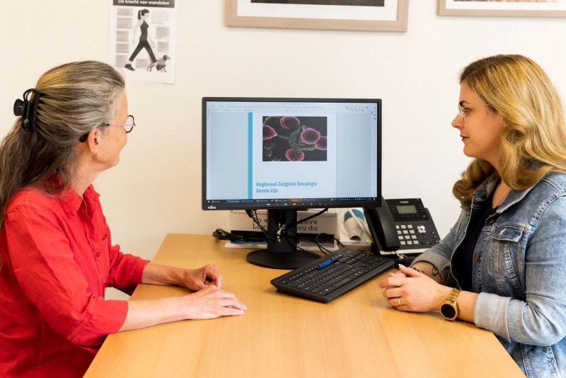 “Ik heb een ochtend met Jolanda meegelopen om te kijken hoe zij de oncologiezorg in haar praktijk organiseert. Daarna ben ik in onze praktijk gaan kijken wie de oncologiepatiënten zijn en met welke patiënten ik direct aan de slag kon. Ik ben gestart met de patiënten die een nieuwe diagnose kregen en uitbehandelde patiënten die door het ziekenhuis zijn terugverwezen, zowel curatief als palliatief. Ook de huisarts is enthousiast en draagt regelmatig patiënten aan die wat extra aandacht nodig hebben. Ik bezoek de geselecteerde patiënten thuis of ik neem telefonisch contact op om te kijken waar ze tegenaan lopen. Ook ben ik er soms juist voor de partner van de kankerpatiënt. Wat ik zowel patiënten als naasten bied, is een luisterend oor en indien gewenst hulp, informatie of tips, zoals bijvoorbeeld informatie over inloophuizen, verwijzing naar POH-GGZ, paramedici en/of lotgenotencontact.”