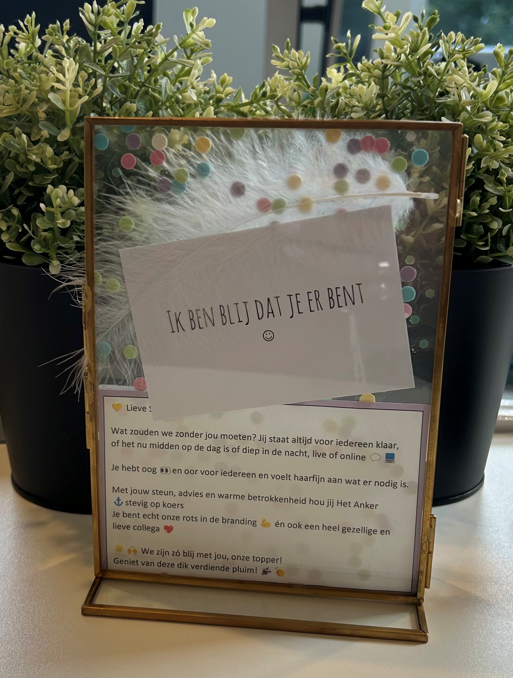 Positiviteit en waardering is een van de krachten van het project Energiek Blijven. Praktijkmanager Angeline is trots dat ze PIM (Positieve Incidenten Melden) heeft geïntroduceerd bij Het Anker. “Dit wordt echt enorm gewaardeerd binnen ons team en wil ik ook als tip meegeven aan andere praktijken.” Medewerkers mogen elkaar voordragen voor iets positiefs: een fijn patiëntcontact, hulp bij een lastige klus, een compliment. “We maken van de PIM’s een kort tekstje of kaartje en leggen dat op het bureau. Een klein gebaar met groot effect.”