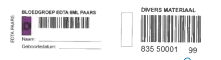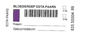 Verwijzers Voor een bloedgroepbepaling bij de 12e- en 27-week screening is het verplicht dat de naam en geboortedatum van de patiënt duidelijk op het etiket van de EDTA-buis zijn genoteerd. Voor de 27e-weekscreening maakt u gebruik van het 'divers etiket'. Op dit etiket kunt u geen patiëntgegevens noteren. Daarom heeft RHMDC het etiket voor een bloedgroepbepaling aangepast. Het is nu te gebruiken voor zowel een routine bloedgroepbepaling (6 ml), 12e-weekscreening (6 ml) en 27e-weekscreening (9 ml)