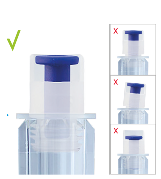 Correct gebruik van de meter Zorg dat de dop stevig op de buis zit. Als deze loskomt tijdens de meting, kan vloeistof in het apparaat lekken en ontstaat er een storing. Dit kan helaas alleen worden opgelost door het apparaat op te sturen naar de leverancier. In het plaatje staat aangegeven hoe de dop op de cuvette moet worden geplaatst.