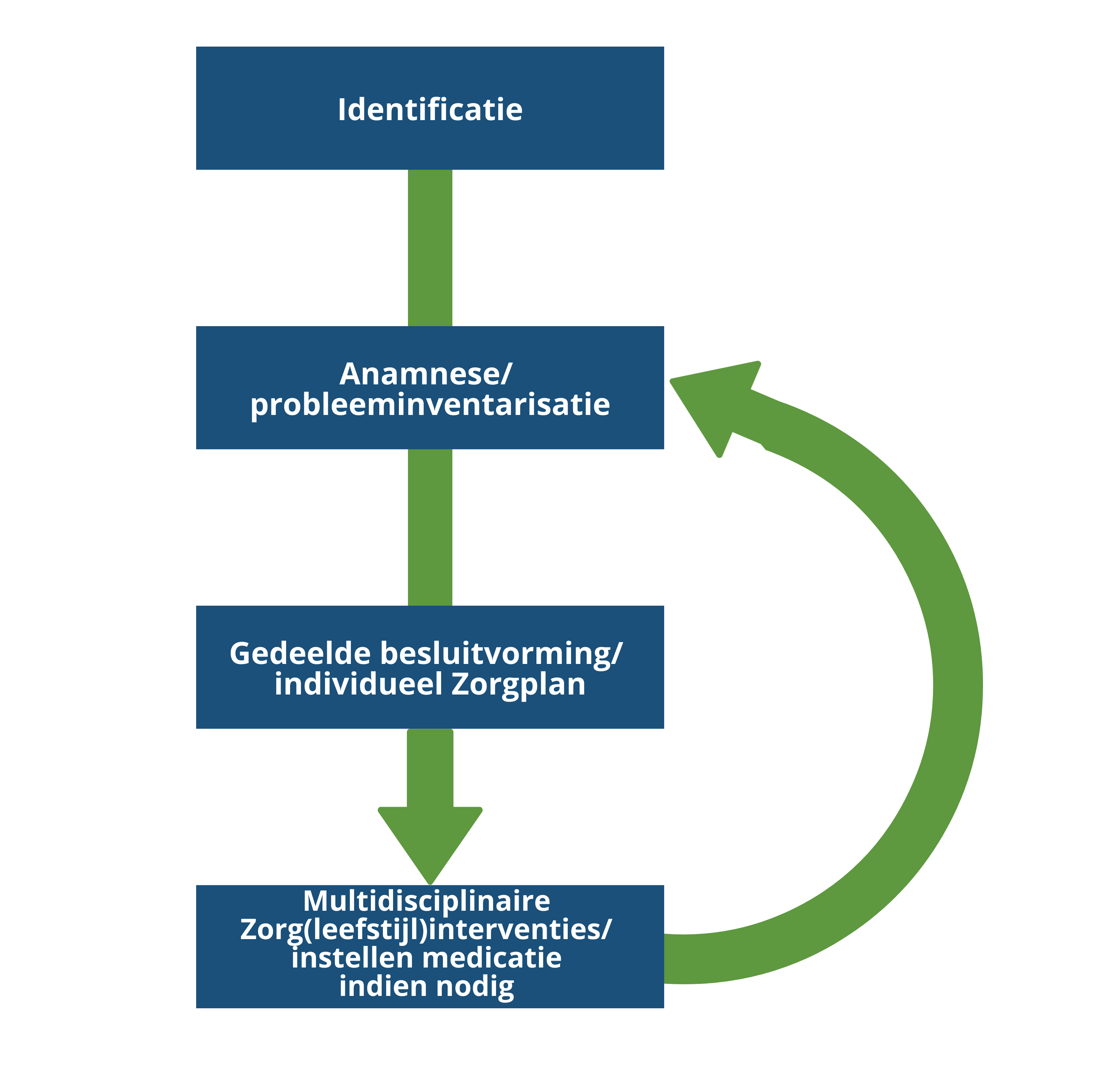 Het controleschema wordt individueel opgesteld, afhankelijk van het risicoprofiel, de co-morbiditeit en de persoonlijke wensen en hetgeen bepaald is in de NHG/CBO CVRM 2019.